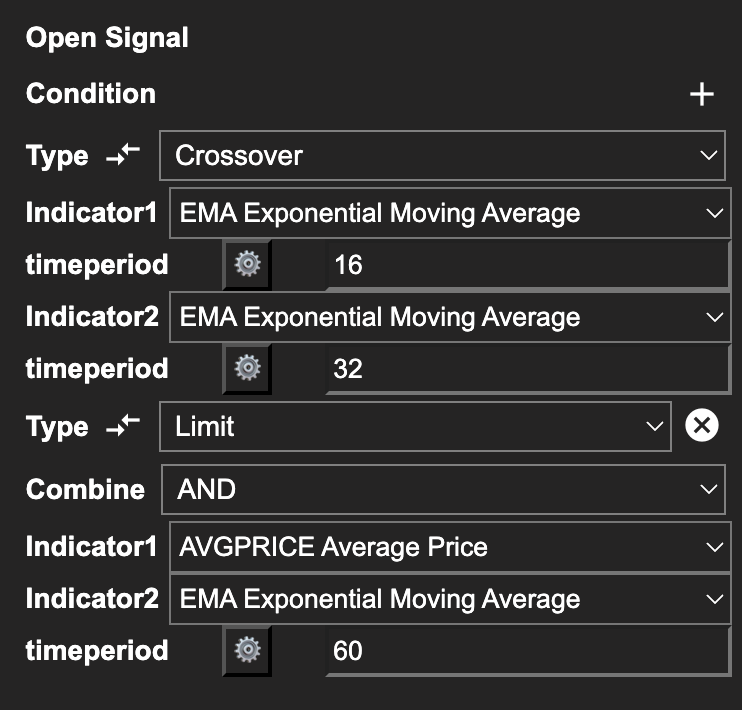 Open signal conditions define when your strategy enters a position. Strateda supports two condition types — Crossover and Limit — which cover the vast majority of technical entry signals. Multiple conditions can be combined using AND/OR logic to build more sophisticated entry rules.