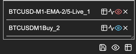 | Table icon | Opens a metrics popup. The content depends on what was loaded: a single backtest shows backtest performance metrics, a live strategy shows live performance metrics. |