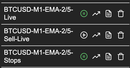 | Play / Pause indicator | Green pause icon = strategy is currently live and running. White play icon = strategy is stopped or is a backtest-only configuration. This is a status indicator, not a button. |