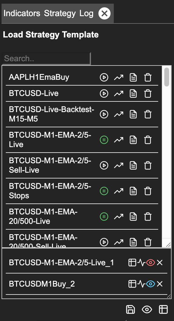 The stored strategy list shows every strategy you have saved, along with any currently connected live strategies. Each strategy entry displays four action icons: