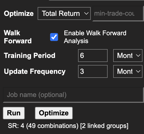 | Update Frequency | Update Frequency | The out-of-sample (OOS) window length — the amount of data used for forward testing in each window. Configured as a number and unit (e.g., 3 Months). |